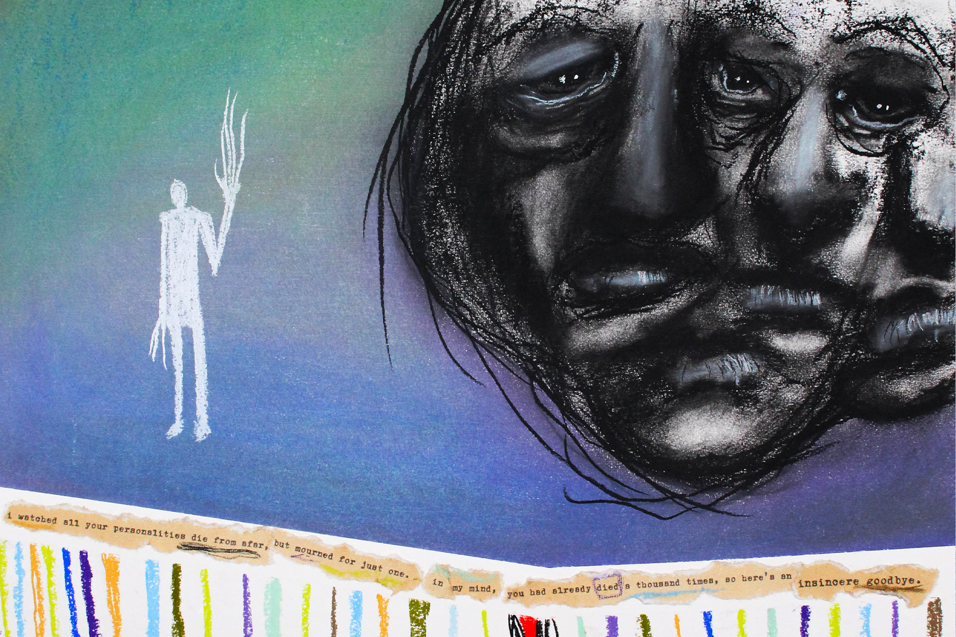 Charcoal, pastel & original poetry on 18 x 24″ 140lb watercolor paper – Available at Hope Unraveling