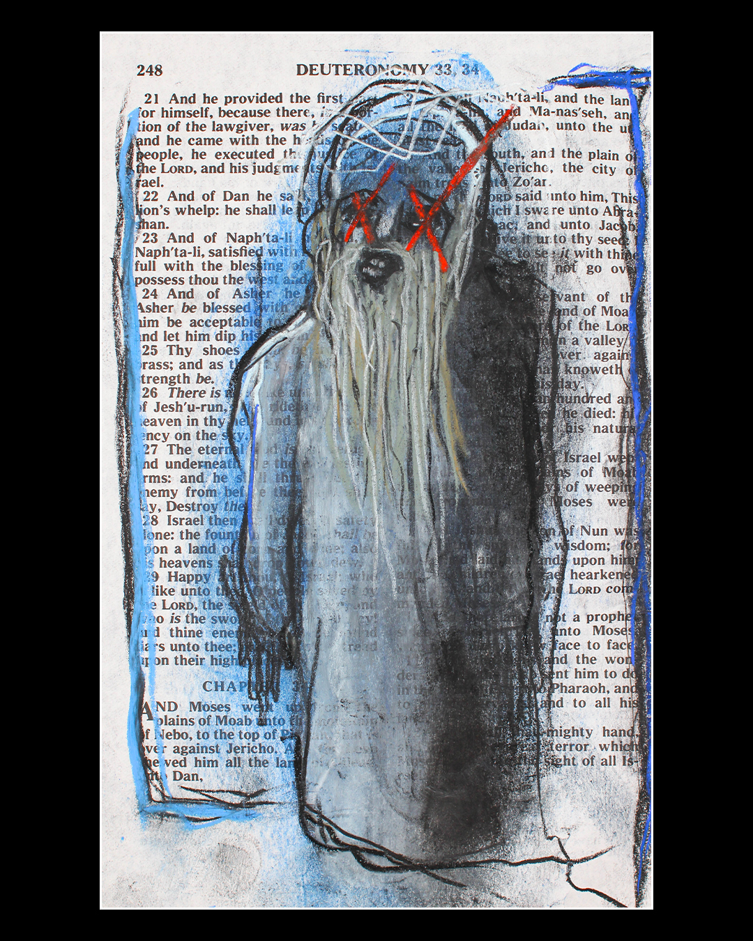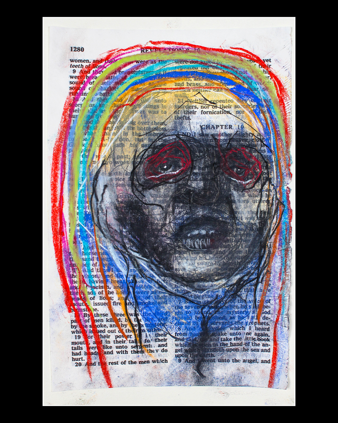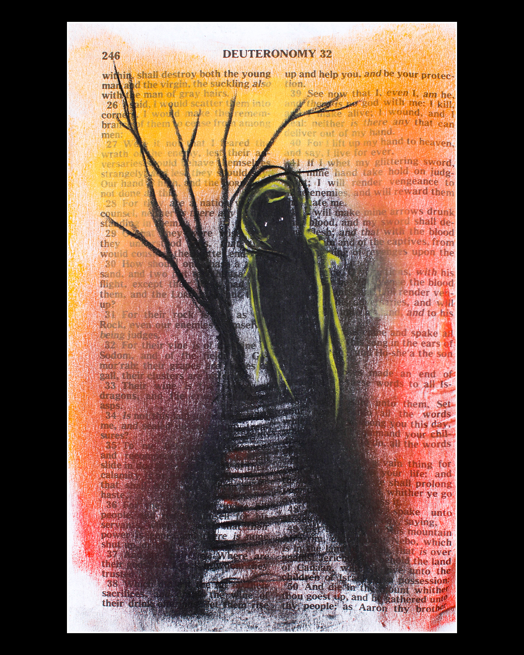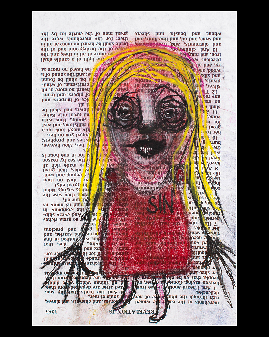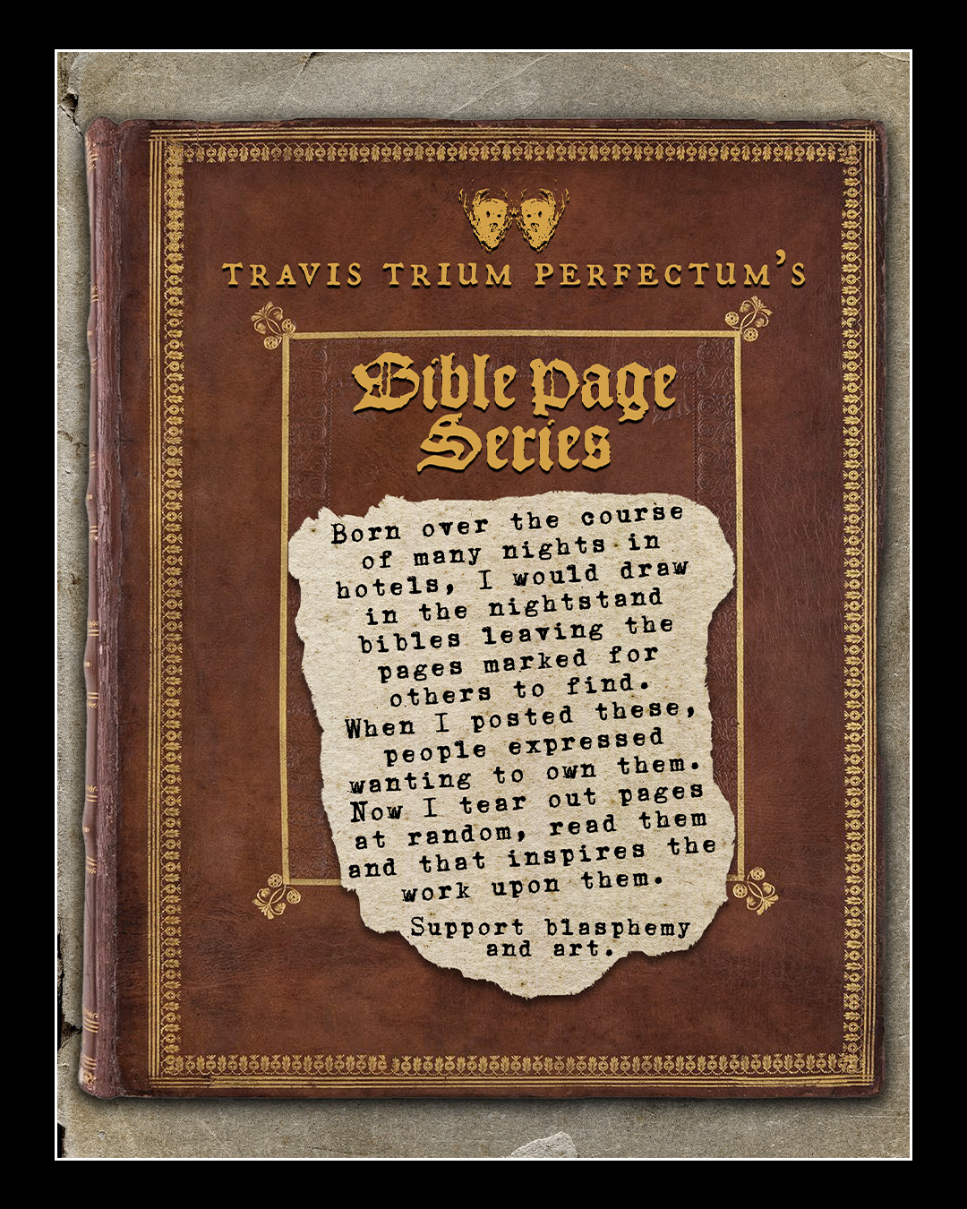 What started as me passing time in all the hotel rooms I stay at across the country touring with my art has now become a sequence of pieces. I will now formally introduce my Bible Page Series. This all started by me drawing on the pages of nightstand bibles in hotels. I would leave these works in them allowing them to potentially be found by an unsuspecting believer or possibly a heathen like myself. As I began posting these, there was a continued sentiment in people wanting to own these works. I began to ponder what that would look like and what I would accomplish in doing this. Blasphemy is such a large part of my expression as an artist, so it seemed like something I would like to explore. In every city I’m in (if there ends up being a nightstand bible), I make sure I tear a few pages out at random. Then when I sit down to create, I read the page fully and that inspires the work upon them. This will be a continued series until I don’t find it inspiring anymore, but so far I have really enjoyed the process. At each tour date this year I am trying to release 3 originals from these pieces making them special to that individual city. I look forward to sharing this creative journey with you all and if you come to a show, you will have an opportunity to own one. The conversations I had about the three pieces I debuted in Louisville, KY this past weekend was great and anyone I talked with about this series loved the concept. Hoping that continues and this can become something special and unique I can continue to share with all of you.