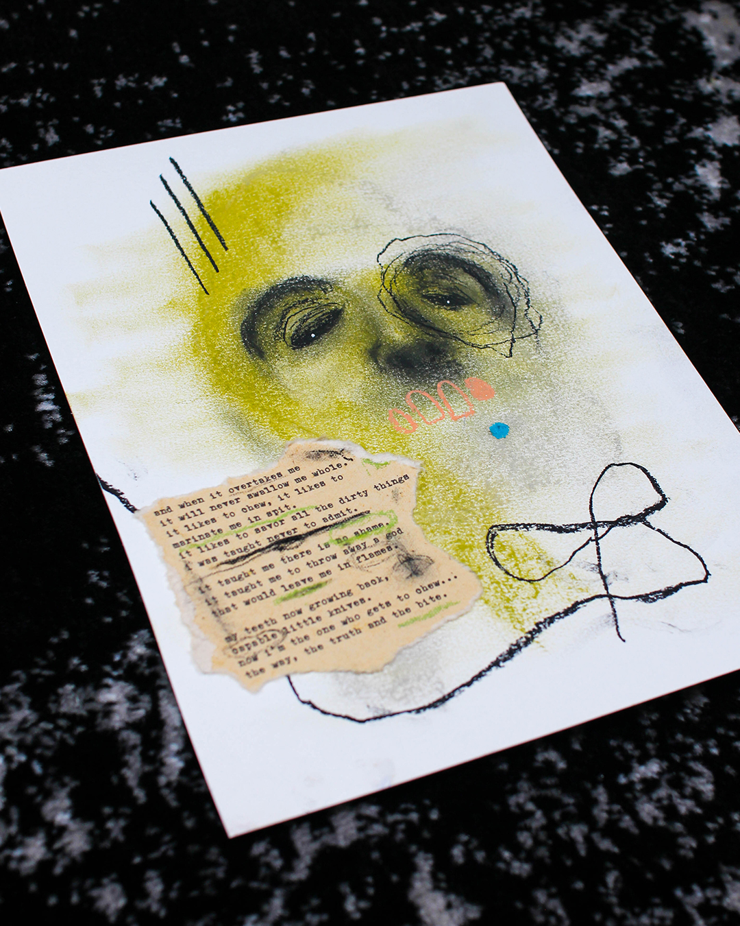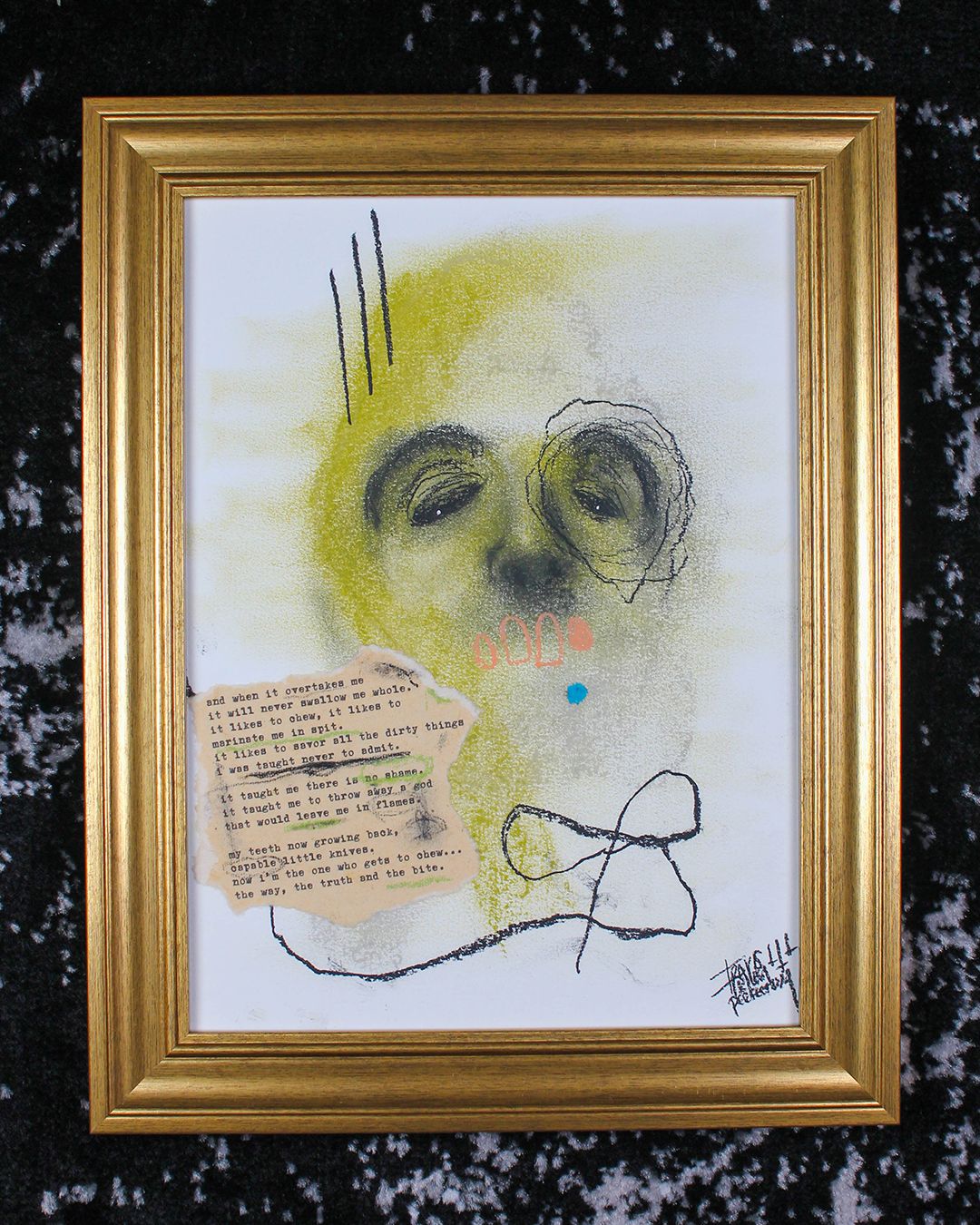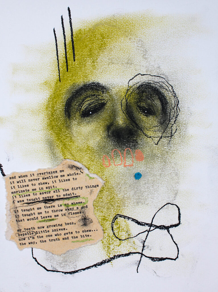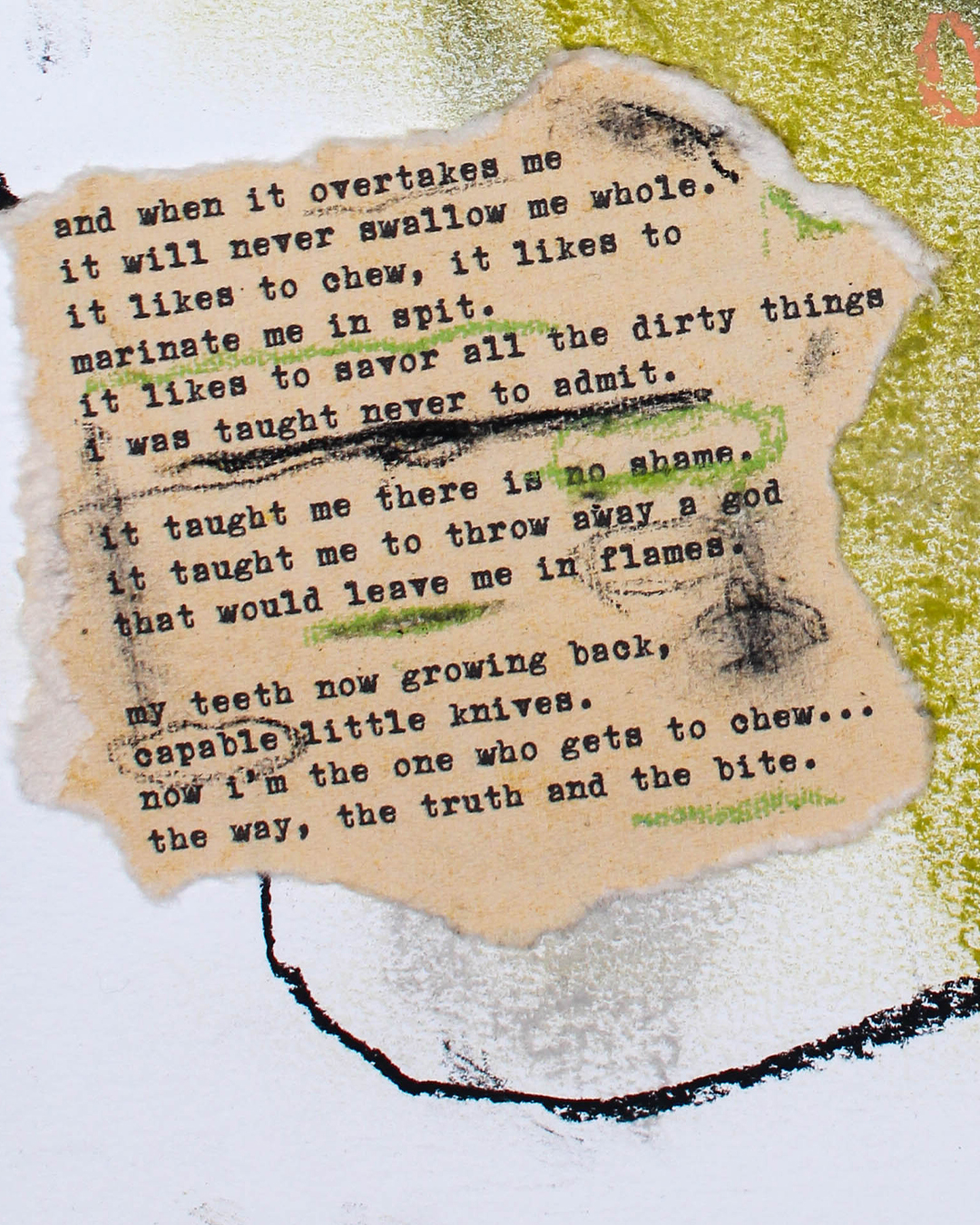 The writing piece reads, “And when it overtakes me it will never swallow me whole. It likes to chew, it likes to marinate me in spit. It likes to savor all the dirty things I was taught never to admit. It taught me there is no shame. It taught me to throw away a god that would leave me in flames. My teeth now growing back, capable little knives. Now I’m the one who gets to chew… The way, the truth and the bite.”