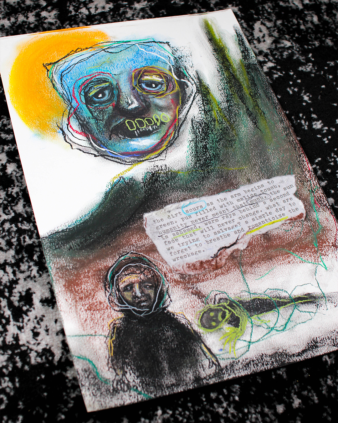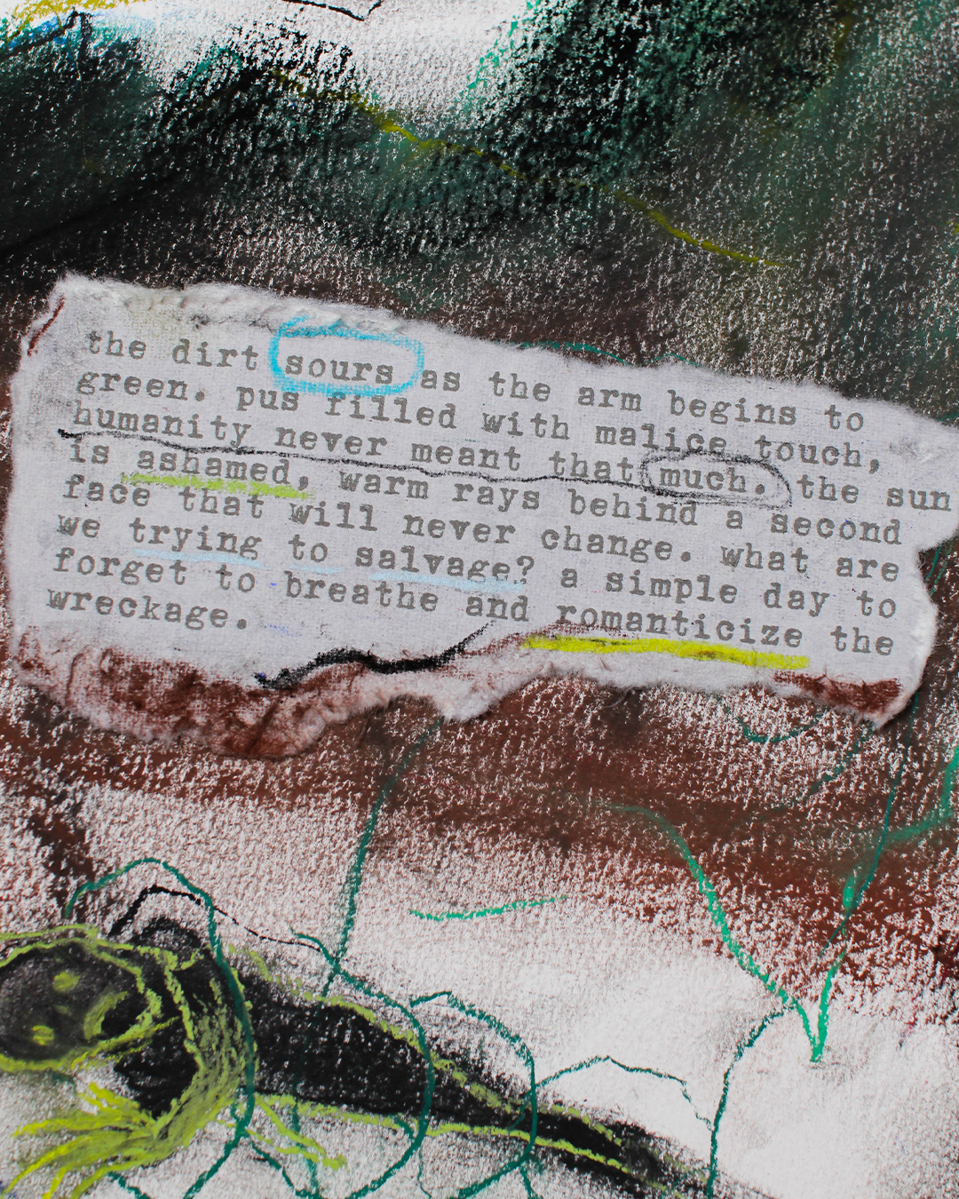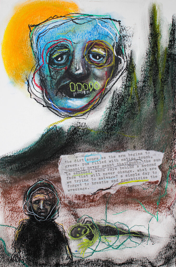 The piece reads โThe dirt sours as the arm begins to green. Pus filled with malice touch, humanity never meant that much. The sun is ashamed, warm rays behind a second face that will never change. What are we trying to salvage? A simple day to forget to breathe and romanticize the wreckage.โ