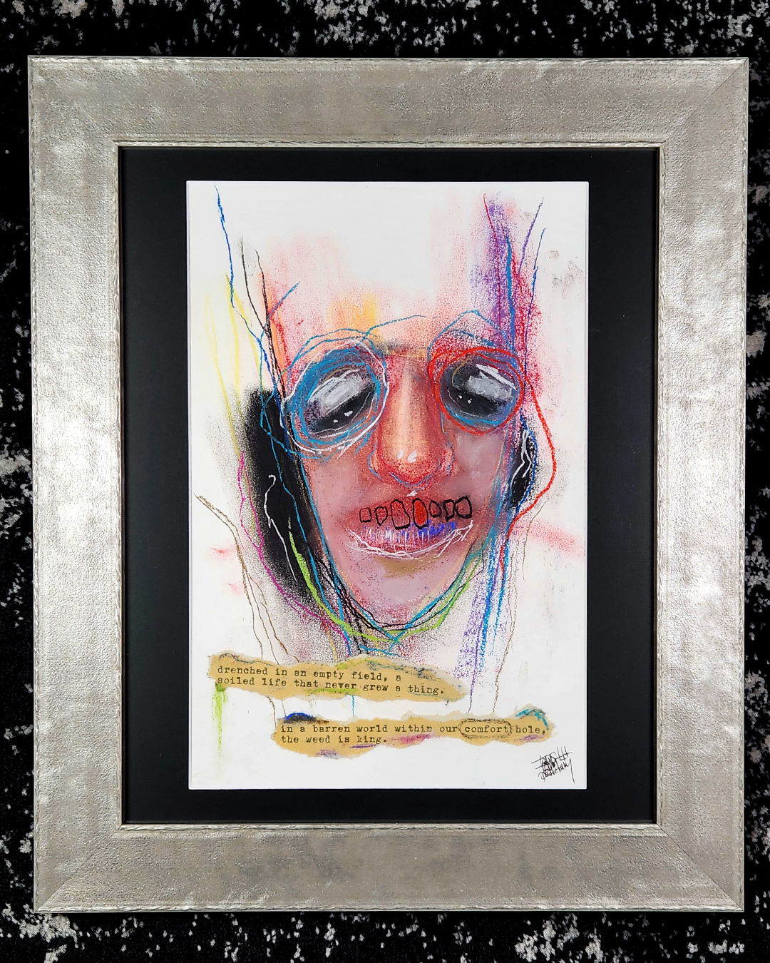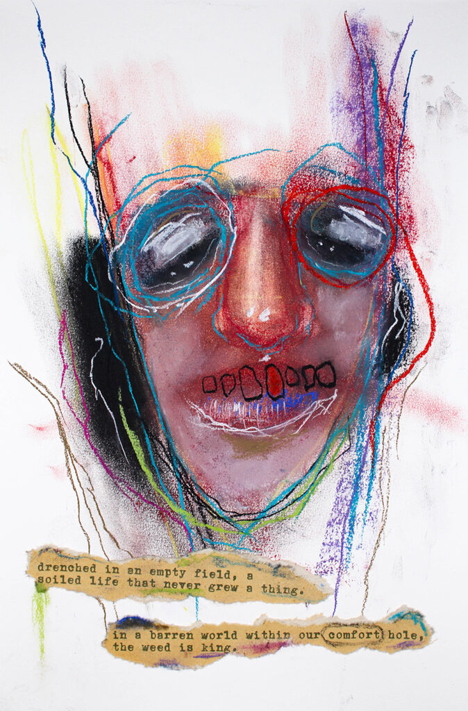 The piece reads “Drenched in an empty field, a soiled life that never grew a thing. In a barren world within our comfort hole, the weed is king.”