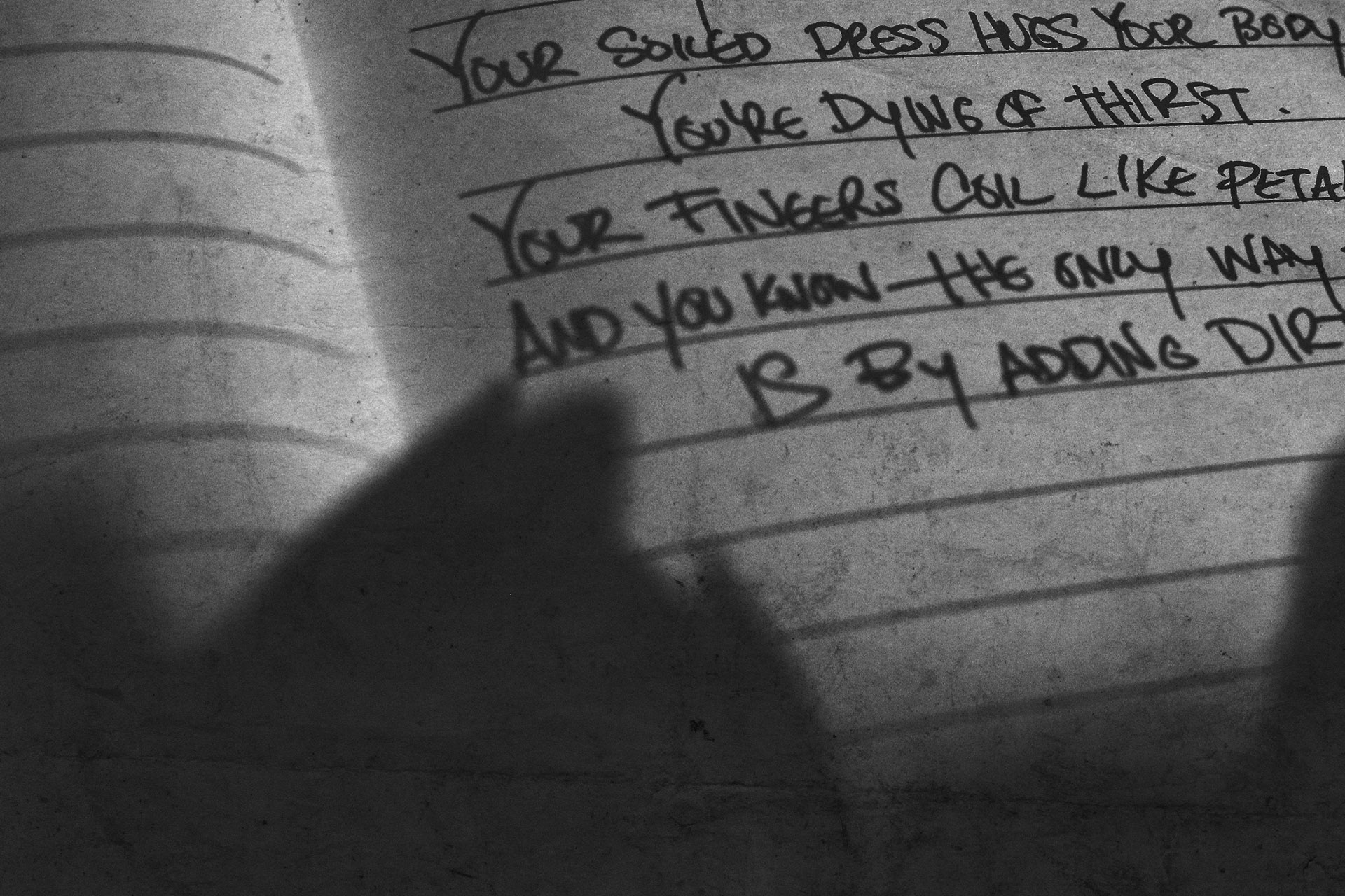 The heart battles with the mind, the pen and the spine. You’ll never survive making love, making love to the memories of time. I have too much confidence to confide in you. A recollection of all the wreckage, this is a life you won’t live through. I realize what I am and deep down you knew, what I am, you won’t live through.